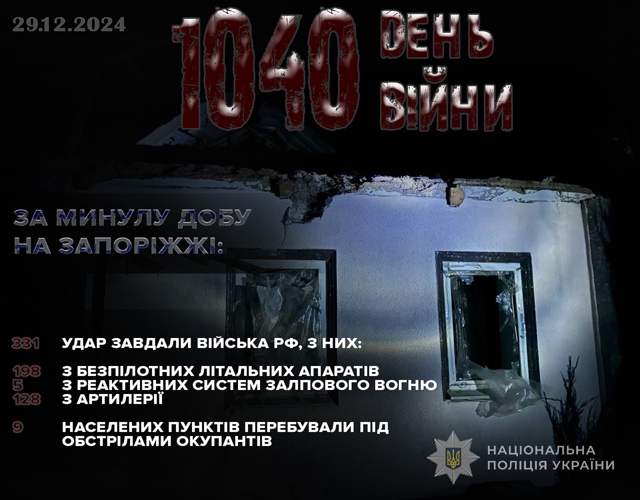 Упродовж минулої доби російські війська здійснили по території регіону 198 БпЛА-атак, завдали 5 ударів з реактивних систем залпового вогню та 128 – з артилерії. Загалом під обстрілами окупантів перебували 9 населених пунктів – Степногірськ, Кам’янське, Гуляйполе, Щербаки, Новоандріївка, Новоданилівка, Мала Токмачка, Чарівне та Новодарівка.