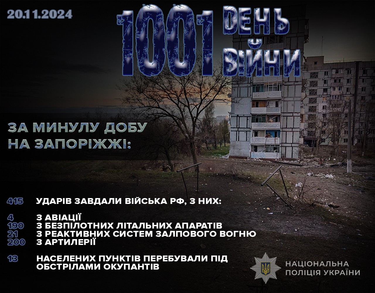 19 листопада поліцейські зафіксували 22 повідомлення про руйнування об’єктів цивільної інфраструктури. Під прицілом рашистських загарбників перебували Степногірськ, Лобкове, Приморське, Новодарівка, Гуляйполе, Щербаки, Новоандріївка, Новоданилівка, Мала Токмачка, Білогір’я, Лугівське, Малинівка та Ольгівське. Внаслідок ворожих влучань пошкоджені приватні та багатоквартирні будинки, заклад освіти.