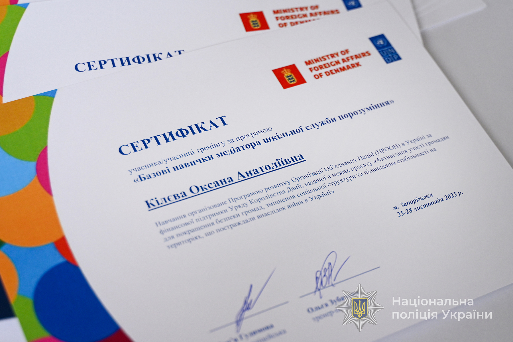 У Запоріжжі ювенальні поліцейські провели тренінг із основ медіації для учнів 7–9-х класів. Захід реалізовано в межах всеукраїнської ініціативи зі створення шкільних служб порозуміння за підтримки Національної поліції України та Програми розвитку ООН (ПРООН).