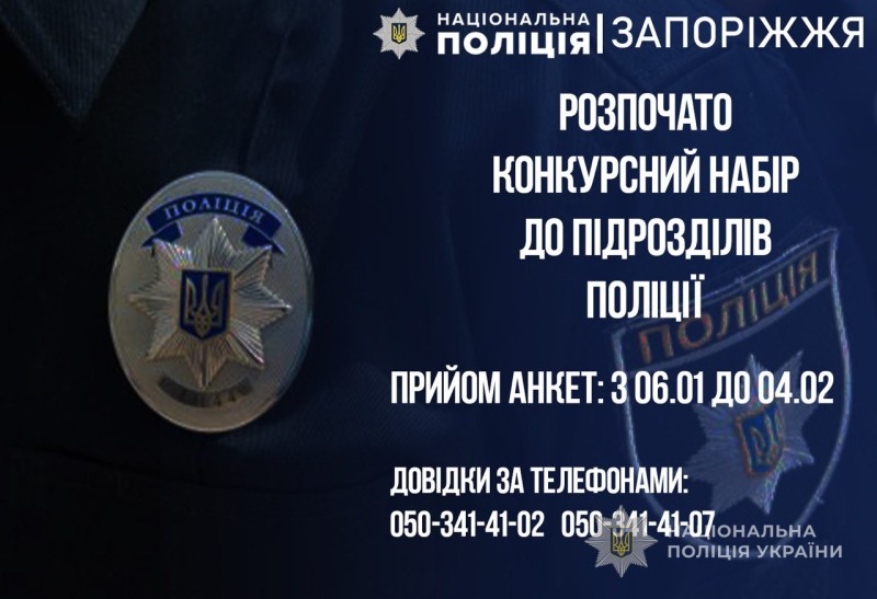 З 6 січня 2024 року розпочато конкурсний відбір на вакантні посади до підрозділів ГУНП в Запорізькій області: