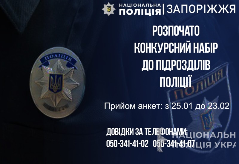 З 25 січня 2024 року розпочато конкурсний відбір на вакантні посади до підрозділів ГУНП в Запорізькій області: