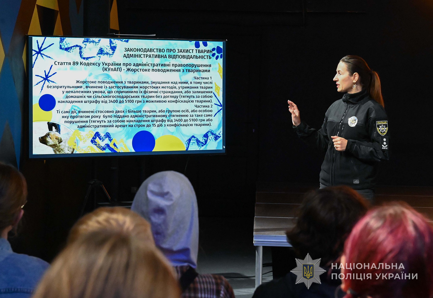 Підлітки дізналися про правила поводження з тваринами, важливість захисту їхніх прав та способи допомоги безпритульним або постраждалим чотирилапим. Ювенальні поліцейські ознайомили школярів із нормами адміністративної та кримінальної відповідальності за жорстоке поводження з тваринами.