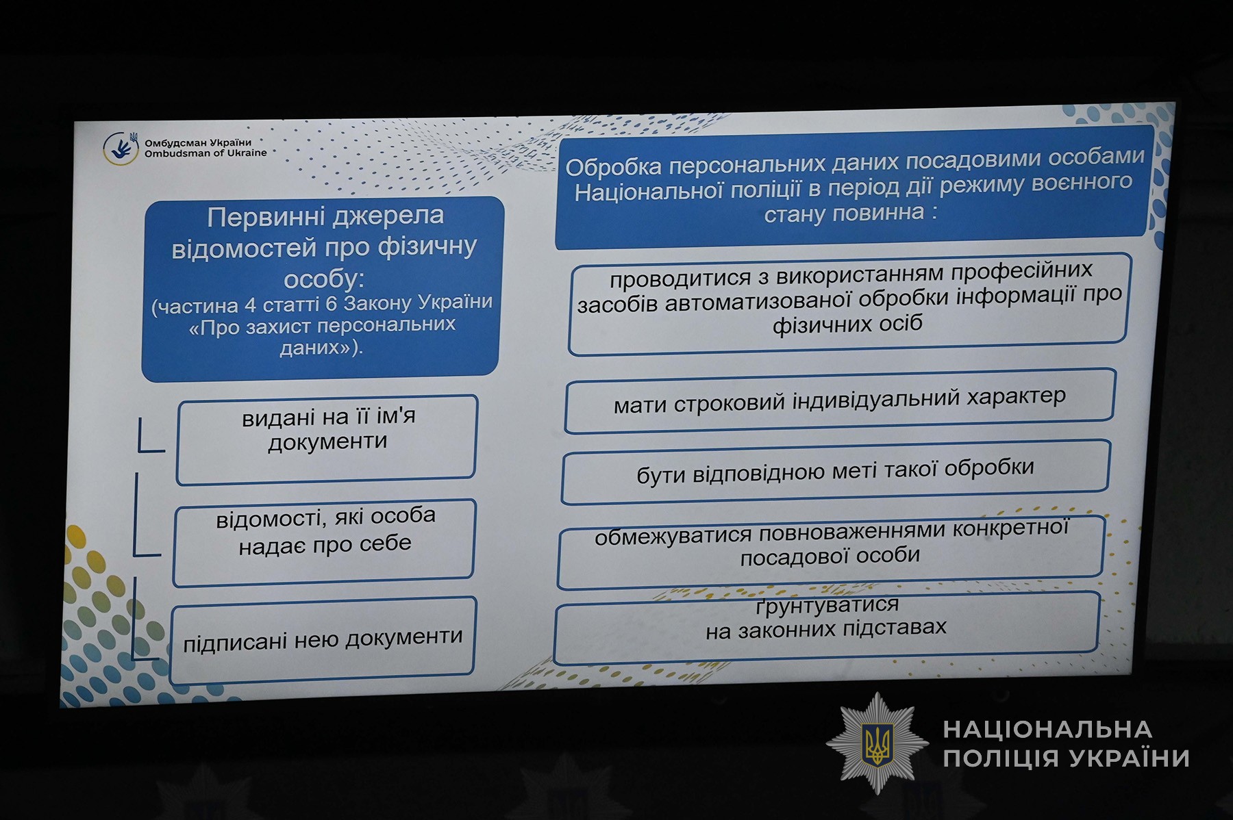 Учасники заходу розглянули актуальні питання законного збору, зберігання та обробки персональних даних, а також відповідальність за порушення прав і свобод людини. Окрему увагу було приділено практичним аспектам застосування вимог законодавства у повсякденній правоохоронній діяльності.