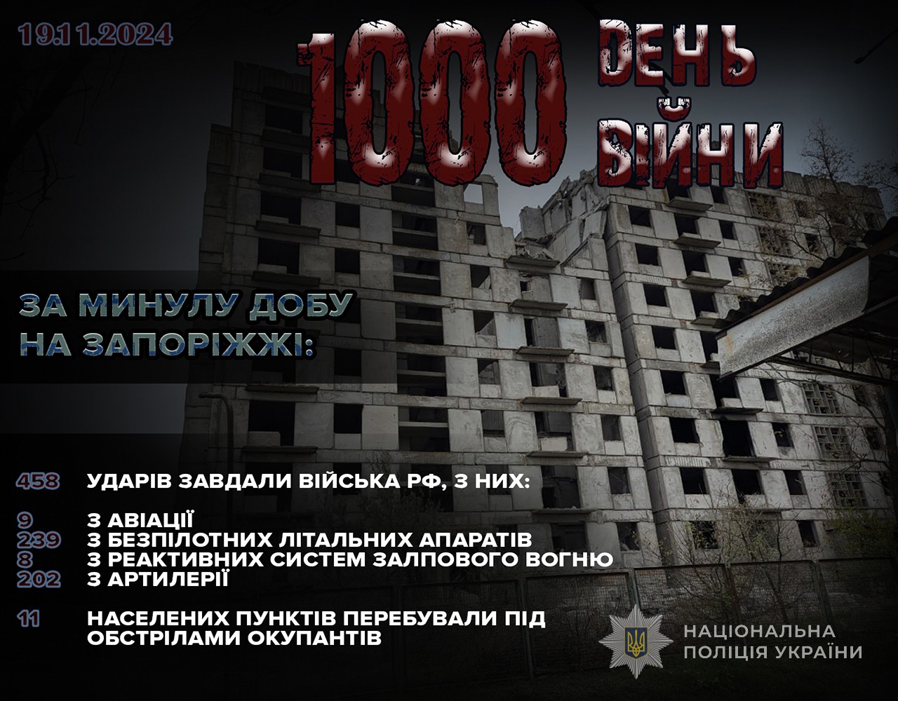 Крім того, окупанти не припиняють обстрілювати інші міста й села прифронтового регіону. Минулої доби правоохоронці зафіксували 458 ворожих ударів. Війська країни-агресора обстріляли Лобкове Василівського району, Малу Токмачку, Новоандріївку, Білогір’я, Гуляйполе, Щербаки, Новоданилівку, Новодарівку, Преображенку та Оріхів Пологівського району.