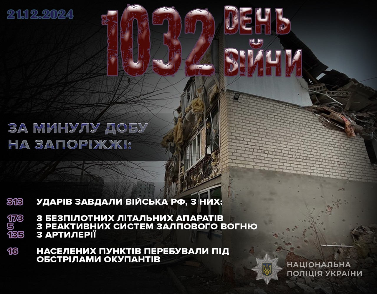 Окупанти не припиняють обстрілювати інші міста й села прифронтового регіону. Минулої доби правоохоронці зафіксували 313 ворожих ударів. Війська країни-агресора обстріляли Підгірне та Новояковлівку Запорізького району, Лобкове та Приморське Василівського району, Гуляйполе, Щербаки, Новоандріївку, Новоданилівку, Малу Токмачку, Білогір’я, Лугівське, Малинівку, Новодарівку, Ольгівське та Оріхів Пологівського району.