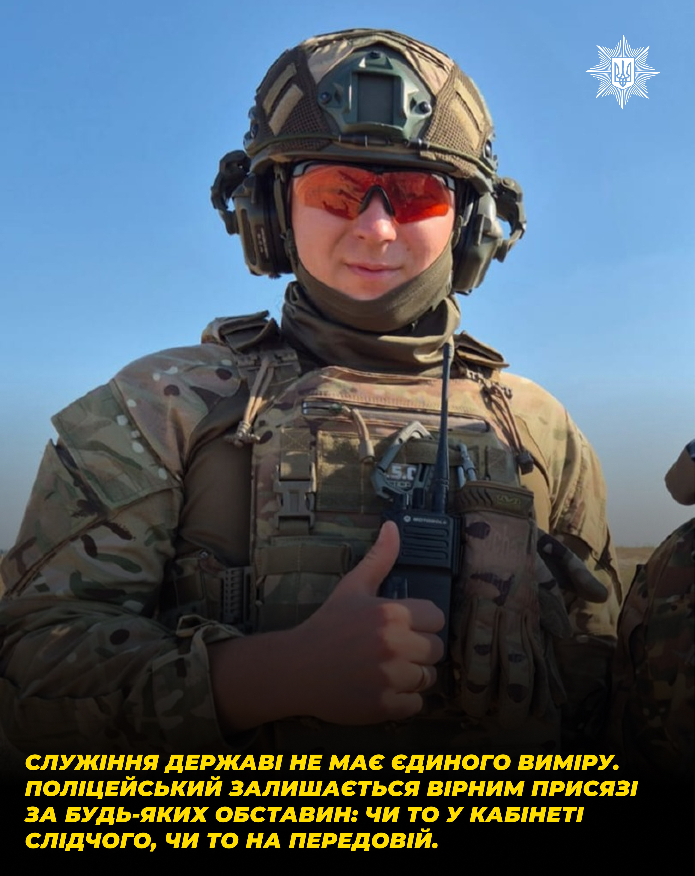 Служіння державі не має єдиного виміру. І приклад Олексія вкотре доводить, що поліцейський залишається вірним Присязі за будь-яких обставин: чи то у кабінеті слідчого, де крок за кроком відновлює справедливість, чи то на передовій, де захищає державу зі зброєю в руках.