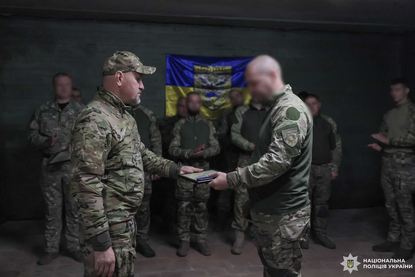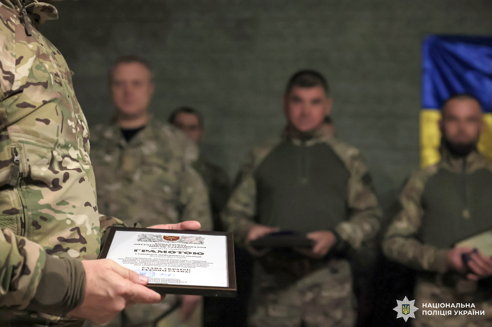 На урочистому нагородженні очільник поліції Запоріжжя Артем Кисько вручив бійцям, які проявили мужність та відвагу під час виконання бойових завдань, державні та відомчі нагороди: відзнаки Президента «За оборону України», подяки та грамоти від Національної поліції та військового командування, почесні нагрудні знаки «Срібний хрест» від Головнокомандувача ЗСУ, медаль «Герою Бердянська» від Бердянської міської військової адміністрації та цінний подарунок.