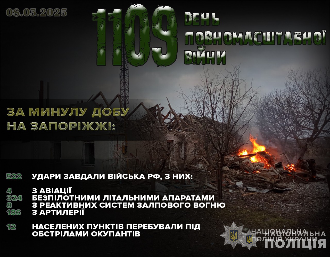 Нагадаємо: 424 удари по населених пунктах Запорізької області за добу: поліцейські задокументували наслідки ворожих обстрілів