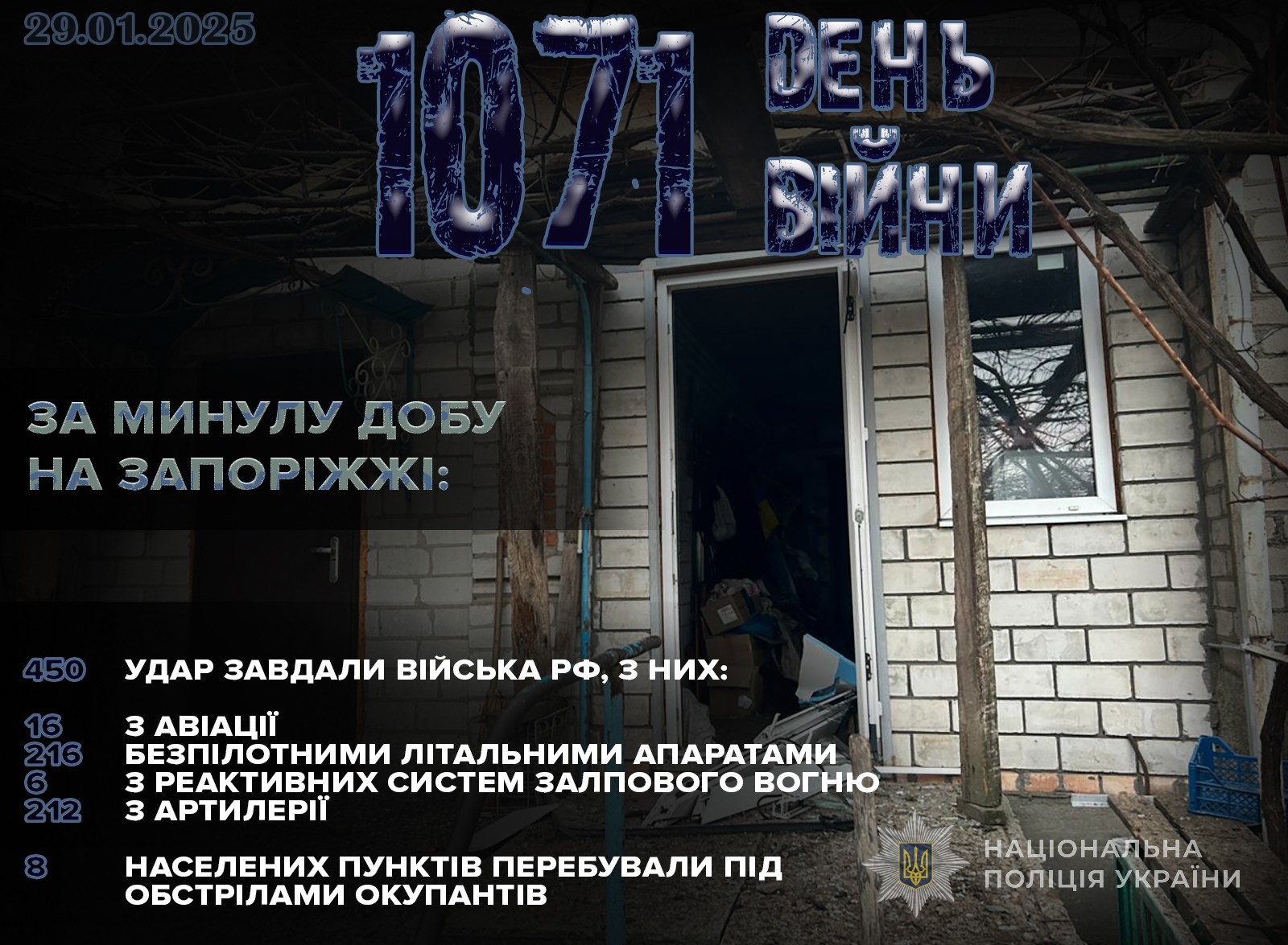 28 січня окупанти 450 разів вдарили з авіації, артилерії, РСЗВ та БпЛА по населених пунктах Запорізької області. Влучання зафіксовані переважно по домоволодіннях мирного населення. Травм зазнала 67-річна жителька Приморського.