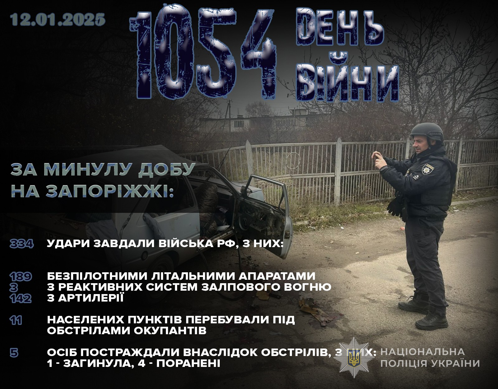 11 січня росіяни завдали 334 ударів по 11 населених пунктах регіону: 142 рази обстріляли з артилерії, 3 – із РСЗВ та запустили 189 ударних дронів по мирних містах і селах Пологівського та Василівського районів.