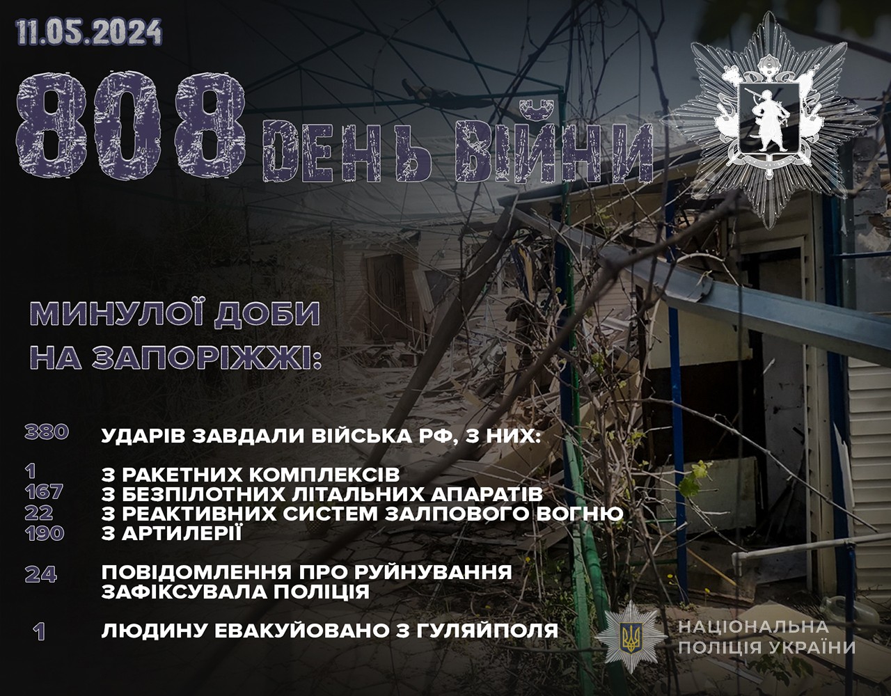 10 травня від обстрілів окупантів потерпали Гуляйполе, Мала Токмачка, Левадне, Роботине, Малинівка, Новоандріївка та Новопавлівка Пологівського району, а також Мар’ївка Запорізького району.