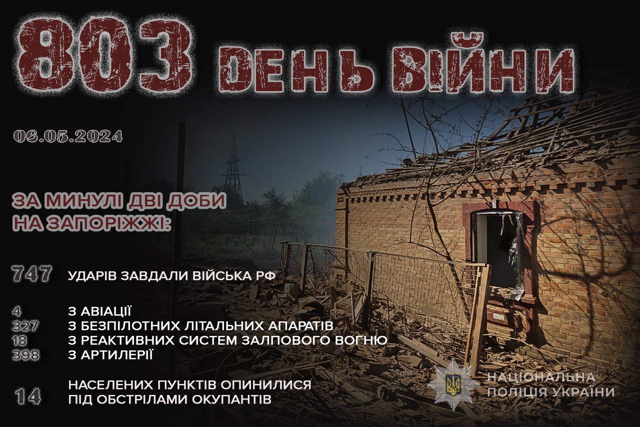 4 та 5 травня росіяни здійснили 747 обстрілів по території Запорізької області. Застосували авіацію, БпЛА, РСЗВ, артилерію. Загалом під ударом ворога опинилися 14 населених пунктів Пологівського та Василівського районів. Обійшлося без поранених.