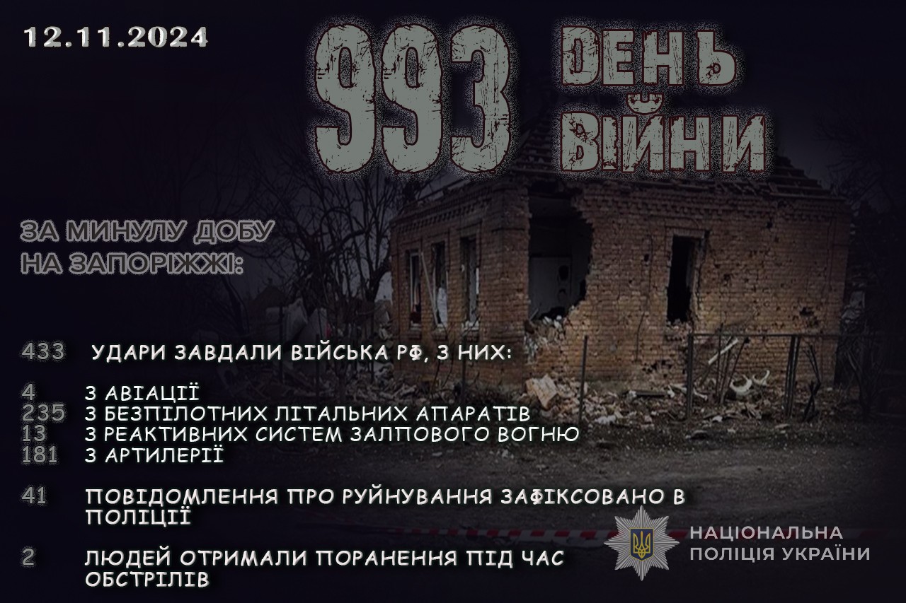 На Запоріжжі слідчі поліції зафіксували наслідки 433 ворожих влучань по інфраструктурі регіону