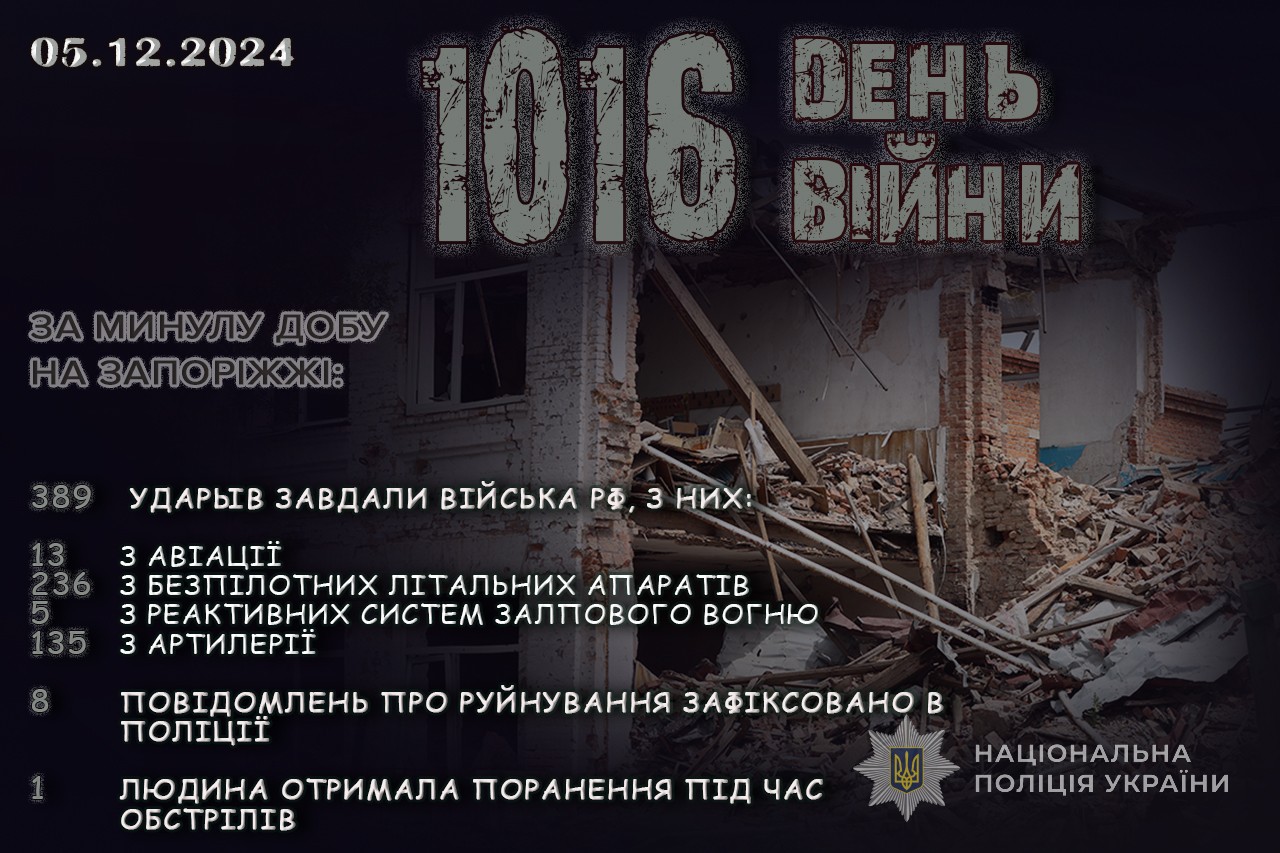 4 грудня окупанти завдали по території регіону 236 ударів безпілотниками, 13 – із авіації, 5 – із РСЗВ та 135 – із артилерії. Пошкоджені домоволодіння мирного населення. Внаслідок влучання дрона поранення отримала літня жителька Комишувахи.