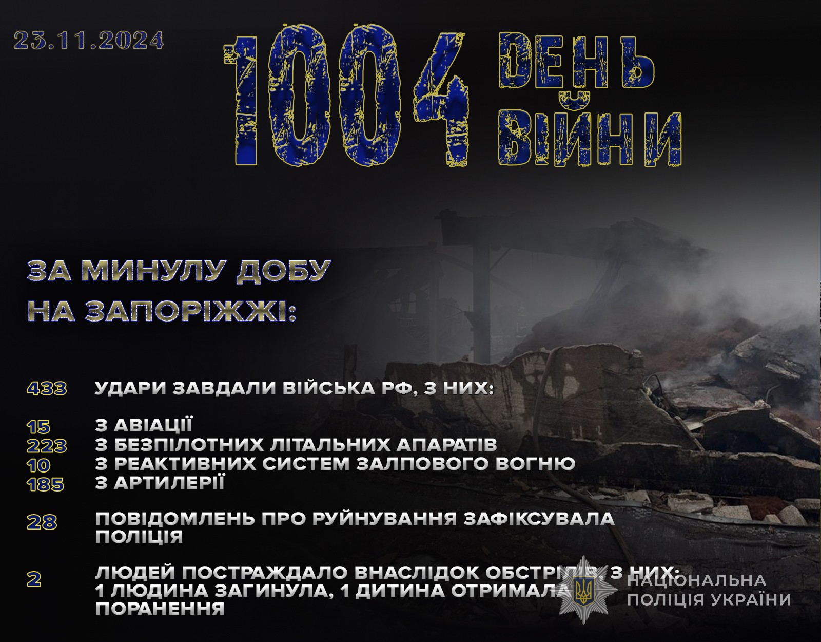 22 листопада окупанти здійснили 15 авіаударів по Запорізькому, Василівському та Пологівському районах, застосували 223 ворожих дрони, вдарили 10 разів із РСЗВ та 185 – з артилерії, завдали ракетного удару по обласному центру. Влучання зафіксовані по територіях приватного підприємства та фермерського господарства, також пошкоджені житлові помешкання громадян. У результаті ворожих атак загинув 55-річний чоловік, 11-річний хлопчик отримав осколкове поранення.