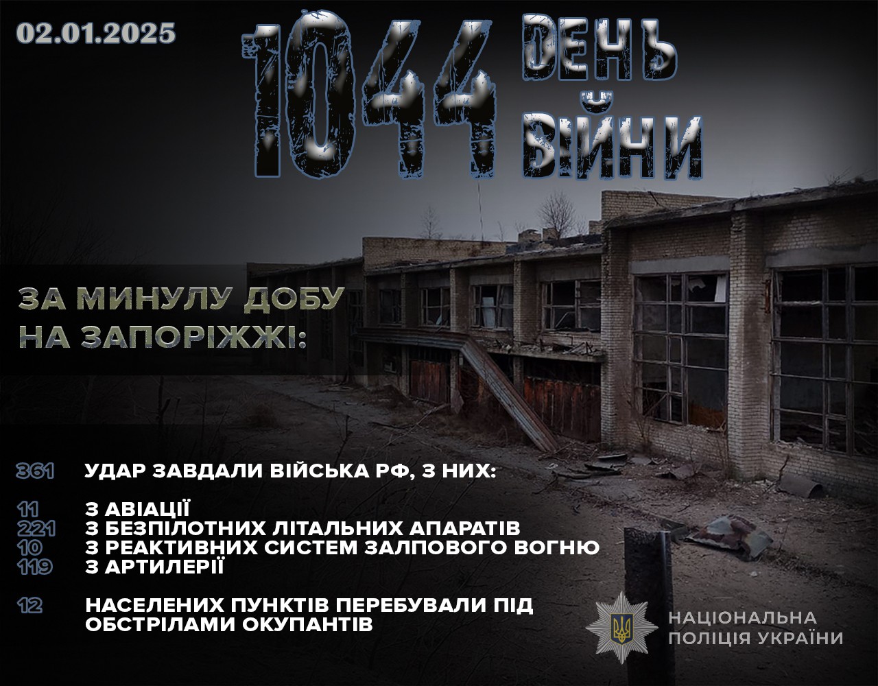 1 січня окупанти завдали 11 авіаударів по Запорізькому району, застосували 221 ударний дрон, 10 разів вдарили із РСЗВ та 119 – з артилерії на пологівському та василівському напрямках.