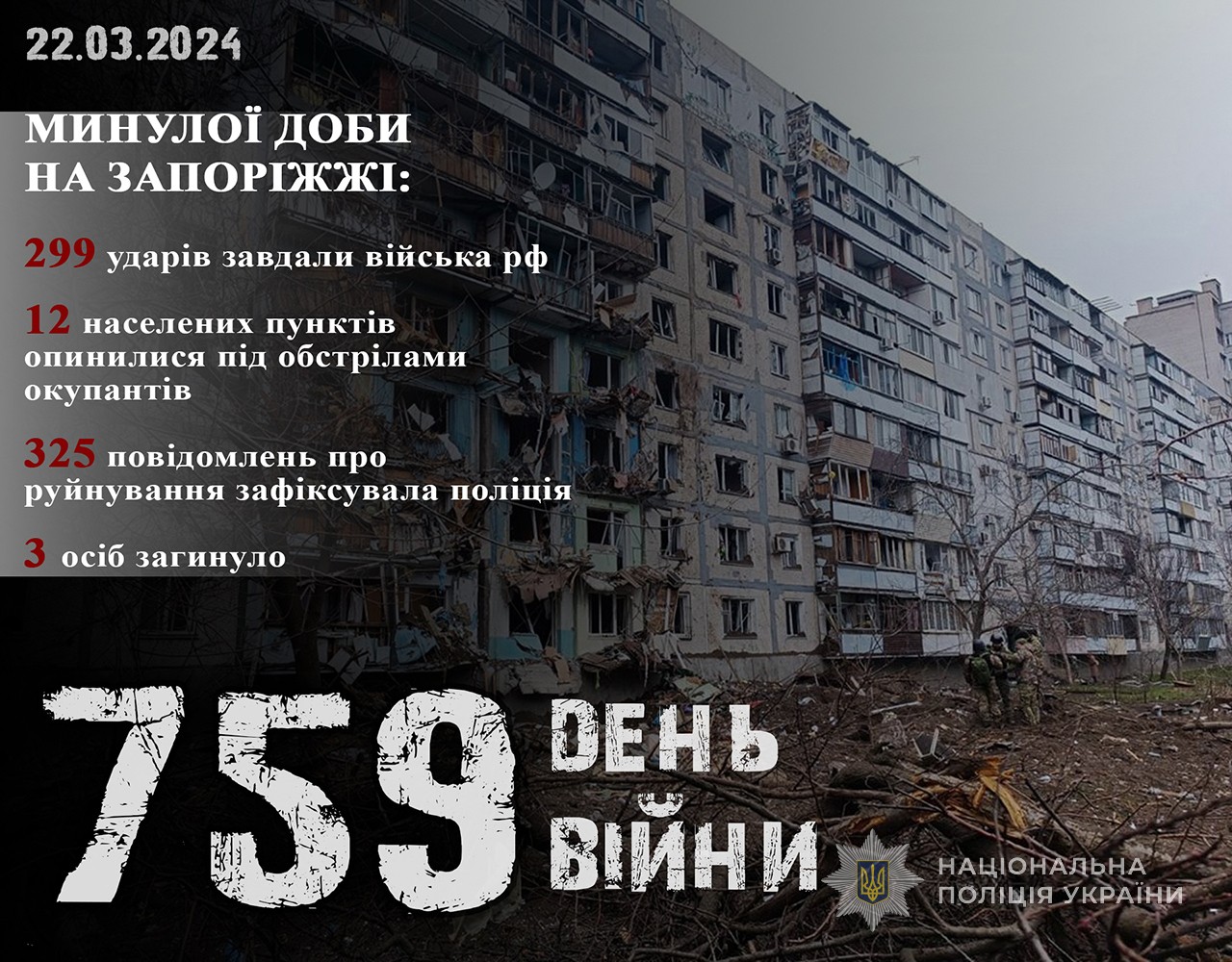22 березня армія рф здійснила масовану ракетну атаку по обласному центру та району. Цього ж дня під ворожим вогнем перебували й інші населені пункти регіону. Внаслідок обстрілів Запоріжжя військовослужбовцями рф постраждало 29 людей та троє загинули.