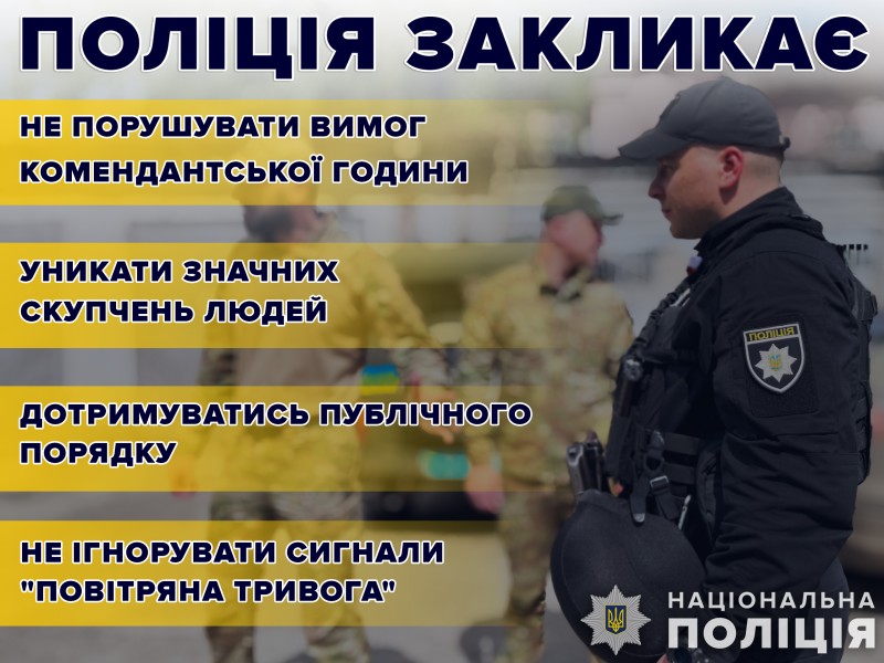 Вартові правопорядку закликають мешканців регіону бути відповідальними і дотримуватися чинного законодавства, правил мінної безпеки і комендантської години, уникати значних скупчень людей та не ігнорувати сигнали «Повітряна тривога!». Пам’ятаємо, що ворог підступний і може вдатися до будь-яких злочинних дій та провокацій.
