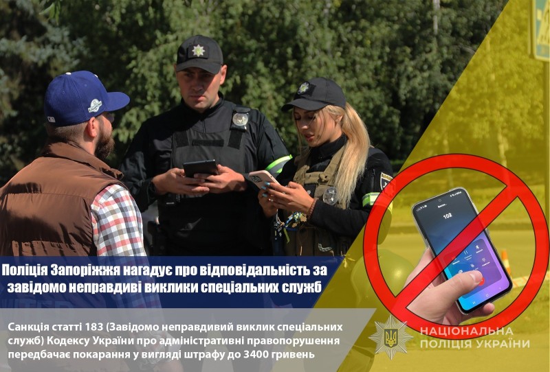 Загалом з початку року поліцейські територіальних підрозділів ГУНП в Запорізькій області склали 1481 постанову за порушення статті 183 (Завідомо неправдивий виклик спеціальних служб) Кодексу України про адміністративні правопорушення. Санкція статті – штраф від 850 до 3400 гривень.