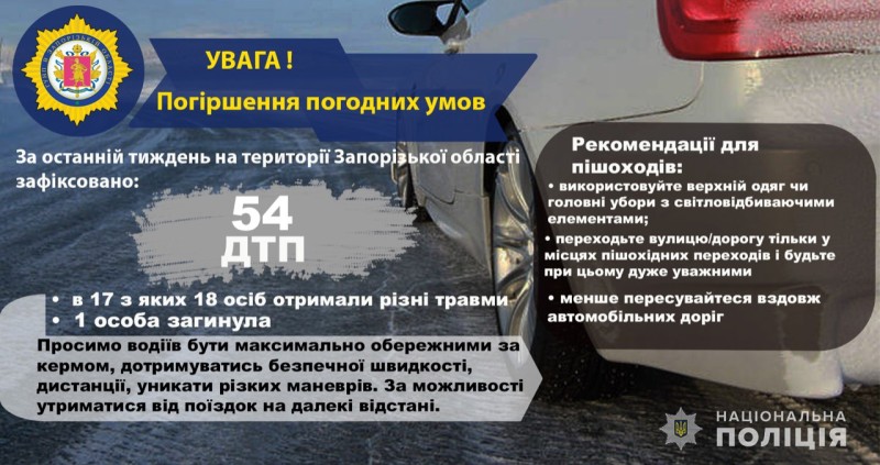 Несприятливі погодні умови можуть призвести до порушення руху транспорту на дорогах і вулицях, тому запорізькі поліцейські закликають усіх учасників дорожнього руху бути максимально уважними та обережними.