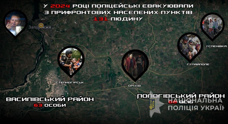2024 рік став для правоохоронців не лише роком протистояння ворогу, а й активної роботи щодо порятунку життів мешканців запорізького регіону. За цей період правоохоронці вивезли з прифронтових населених пунктів 131 людину, у тому числі – 24 дитини. Наразі евакуйовані громадяни мають тимчасовий прихисток у шелтерах або гуманітарних хабах, деякі оселилися у знайомих чи родичів.