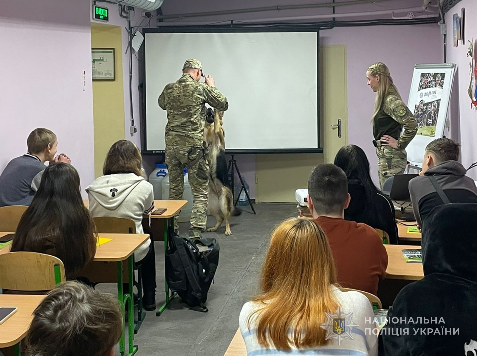 А почалося все з видовищної демонстрації кінологів: службові собаки показали навички пошуку наркотичних речовин, а учні - небувалу активність і зацікавленість.