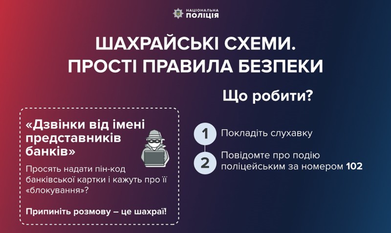Телефонне шахрайство залишається в топі найпоширеніших схем аферистів. «Вашу карту заблоковано», «з вашого рахунку здійснюється підозріла транзакція», «ми здійснюємо перевірку клієнтів», «нові правила під час воєнного стану» – зловмисники використовують різні способи, аби отримати доступ до банківських даних громадян. Якщо від вас вимагають персональні дані карткових рахунків, негайно телефонуйте до банківської установи та на спецлінію 102.
