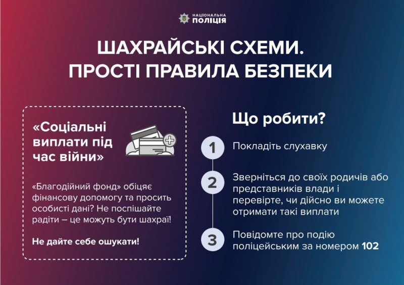 А 63-річна жінка поспілкувалася по телефону з псевдопрацівником банку. Він повідомив, що їй схвалено соціальну грошову допомогу від міжнародної організації в сумі понад 6 тисяч гривень, але треба здійснити деякі операції. За вказівкою невідомого, потерпіла зайшла до мобільного додатку та, не усвідомлюючи небезпеку, перевела близько 10 тисяч гривень на інший рахунок.