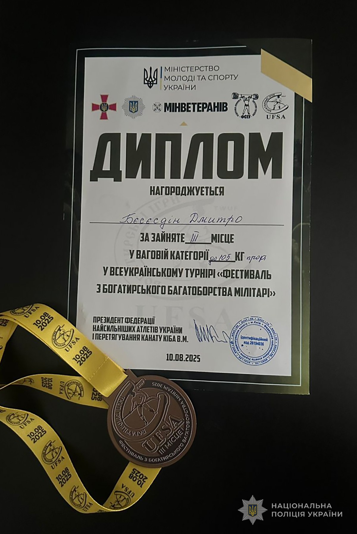 У ваговій категорії до 105 кг гідно виступив запорізький поліцейський Дмитро Бєсєдін. У кожному етапі змагань він викладався на повну, демонструючи приклад справжньої сили й витривалості. Як результат - почесне третє місце на п’єдесталі серед найсильніших представників силових структур країни.