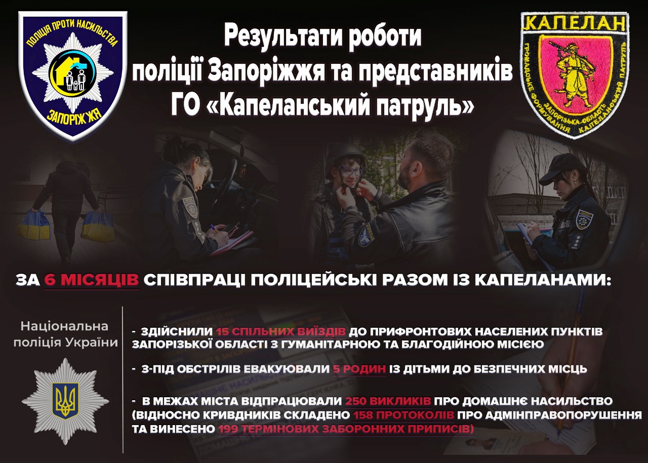 Ми реагуємо на виклики про домашнє насильство не лише як на факт правопорушення, а як на людську трагедію, яка потребує комплексного підходу. В таких випадках поліція потрібна для захисту та дій, а капелани – для слова, підтримки та молитви. Таким чином, за півроку спільної роботи наряди поліції Запоріжжя та капеланів відпрацювали понад 250 викликів про домашнє насильство. За цей період працівники поліції склали відносно кривдників 158 матеріалів про адмінправопорушення та винесли 199 термінових заборонних приписів.