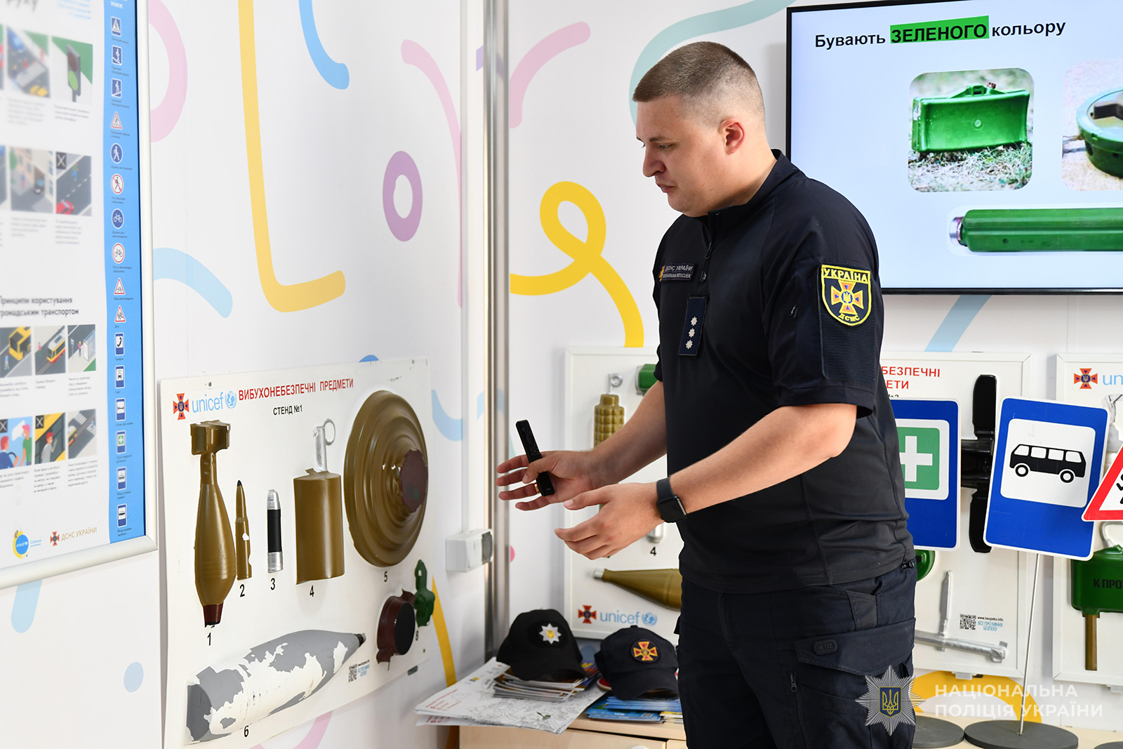 Окрему увагу приділили темі мінної безпеки. Фахівці ДСНС ознайомили дітей із виглядом різних типів вибухонебезпечних предметів, продемонстрували навчальні макети та пояснили порядок дій у разі їх виявлення. Особливо підкреслили: торкатися підозрілих об’єктів категорично заборонено.
