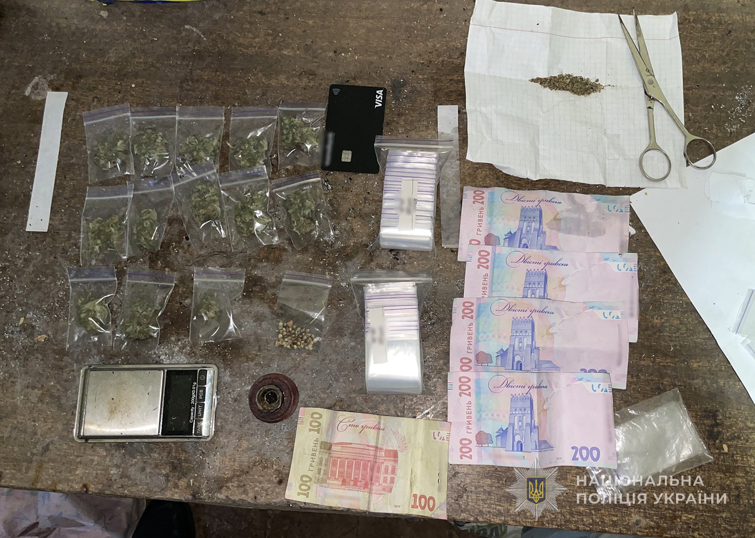 За результатами обшукових заходів правоохоронці виявили та вилучили 15 зіп-пакетів із речовиною рослинного походження (попередньо – канабіс) та два паперові згортки із подібною речовиною, пакети для фасування, три мобільні телефони, два блокноти із записами, банківську картку, електронні ваги і 1 400 гривень, ймовірно отримані злочинним шляхом.