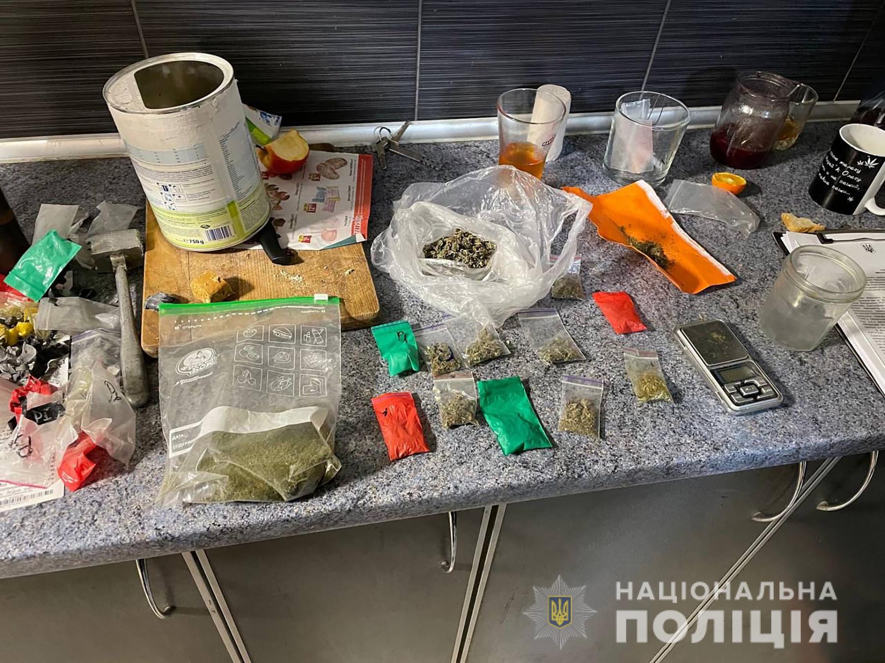 В ході обшуку у домоволодінні по вулиці Електролізній поліцейські виявили та вилучили більше півкілограма речовини рослинного походження. Уся вона була «розфасована» для подальшої реалізації в згортки та зіп-пакети. З місця обшуку вилучено понад 100 згортків, декілька пакетів та електронні ваги.