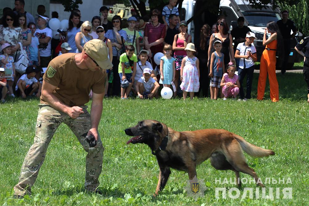 Бурхливі емоції дітей вирували біля кінологів зі службовими собаками. Демонстрація навичок тварин у затриманні правопорушників та знаходженні небезпечних предметів, викликала щире захоплення присутніх.