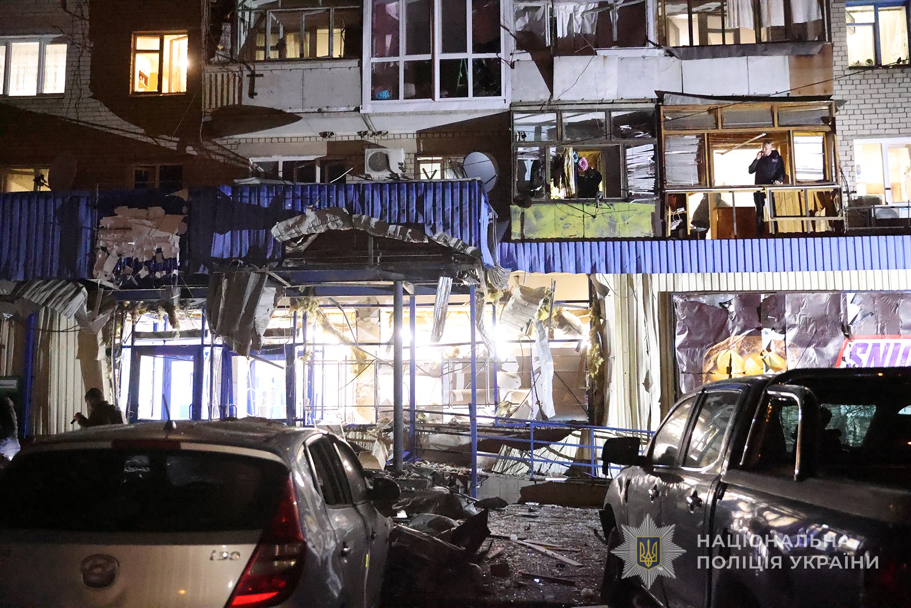 Загалом унаслідок вибуху пошкоджений фасад багатоповерхівки, вилетіли шибки, зруйнований ґанок супермаркета.