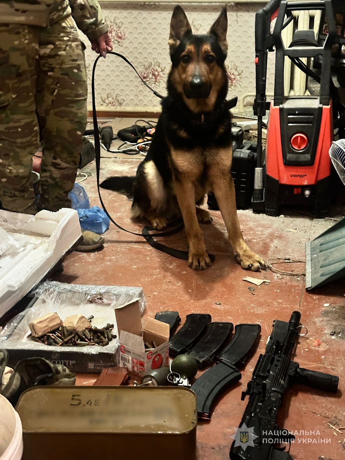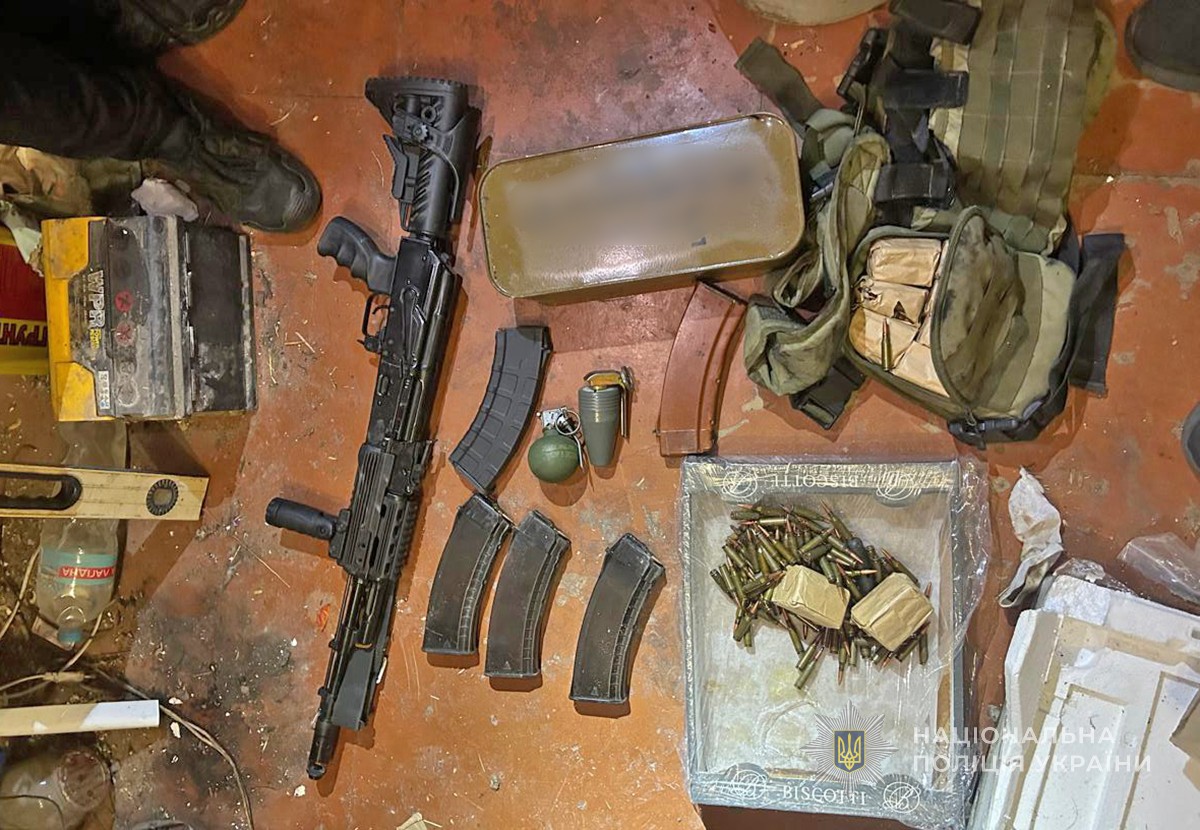 Цього ж дня у помешканні фігуранта правоохоронці із залученням кінологічної пари ГУНП в області провели огляд та виявили автомат Калашникова, шість магазинів і близько 1800 патронів до нього, а також дві гранати іноземного виробництва.
