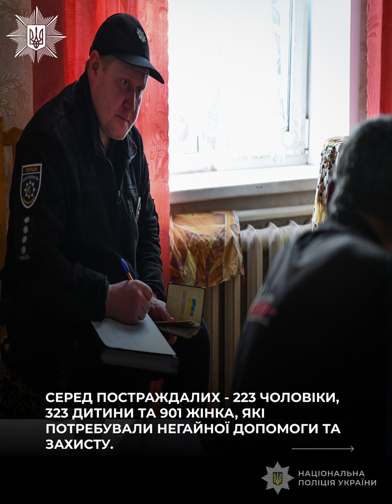 Серед постраждалих - 223 чоловіки, 323 дитини та 901 жінка, які потребували негайної допомоги та захисту.
