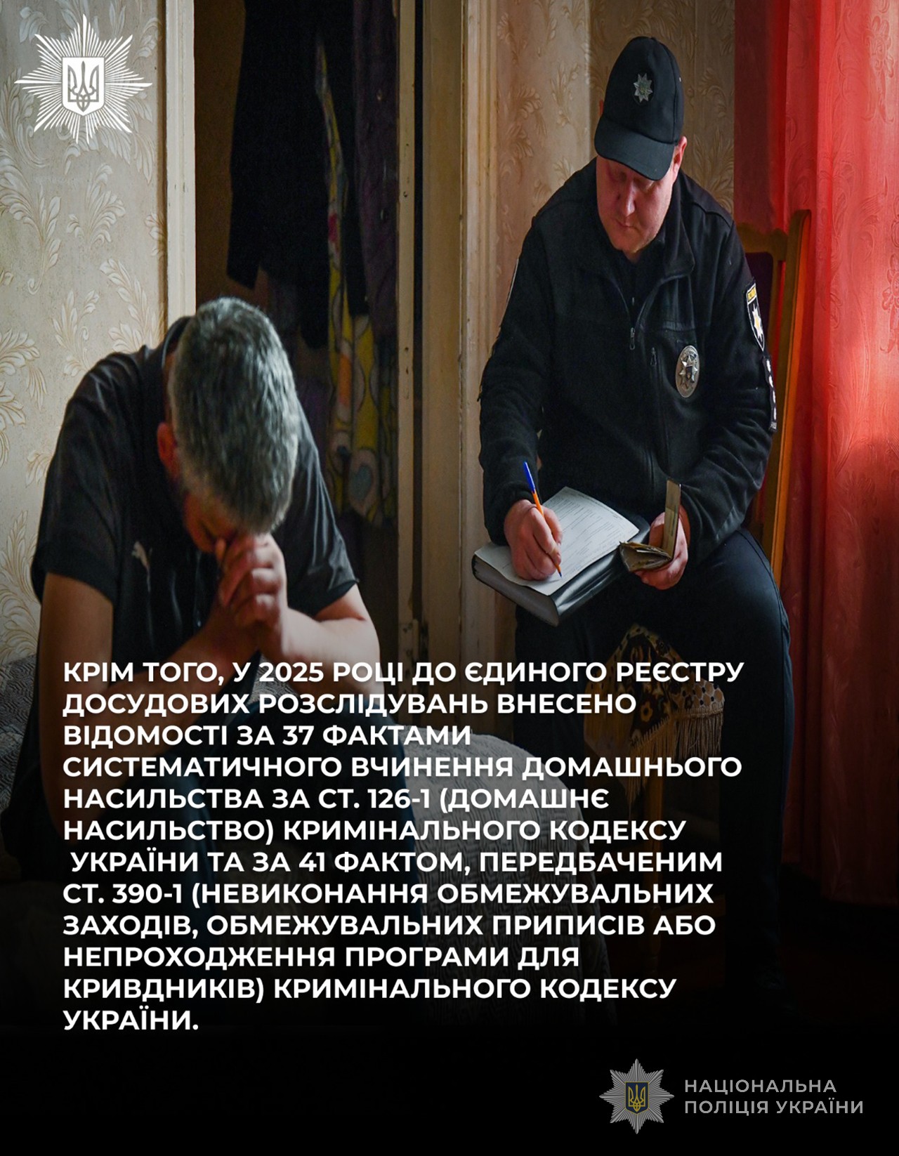 Крім того, у 2025 році до Єдиного реєстру досудових розслідувань внесено відомості за 37 фактами систематичного вчинення домашнього насильства за ст. 126-1 (Домашнє насильство) Кримінального кодексу України та за 41 фактом, передбаченим ст. 390-1 (Невиконання обмежувальних заходів, обмежувальних приписів або непроходження програми для кривдників) Кримінального кодексу України.