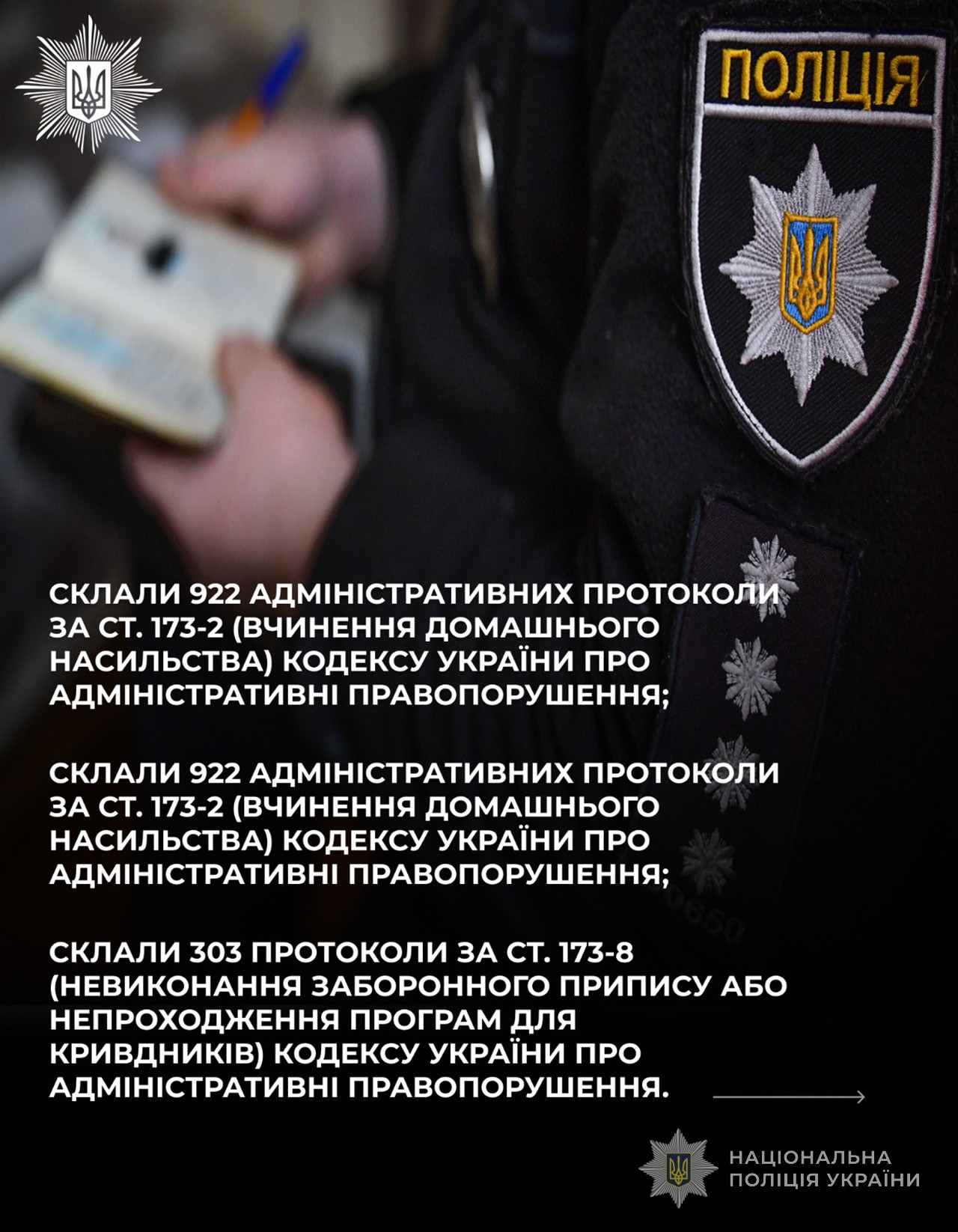 • склали 922 адміністративних протоколи за ст. 173-2 (Вчинення домашнього насильства) Кодексу України про Адміністративні Правопорушення;