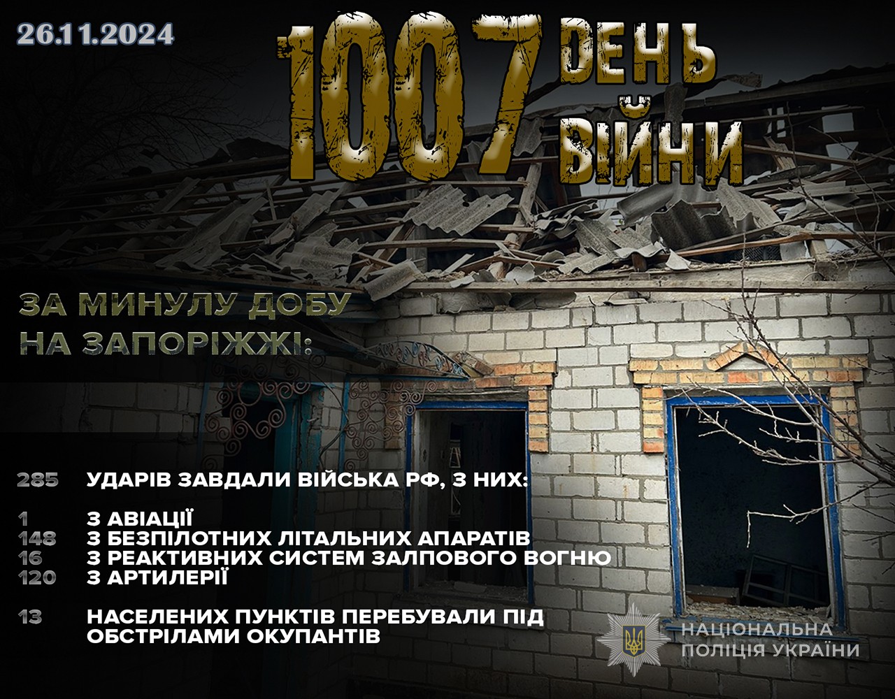 25 листопада під обстрілами окупаційних військ перебували населені пункти Пологівського та Василівського районів. По мирних містах і селах росіяни вгатили з авіації, застосували 148 БпЛА різної модифікації, завдали 120 артударів та 16 – з реактивних систем залпового вогню. У результаті ворожих обстрілів постраждав 74-річний житель Залізничного.
