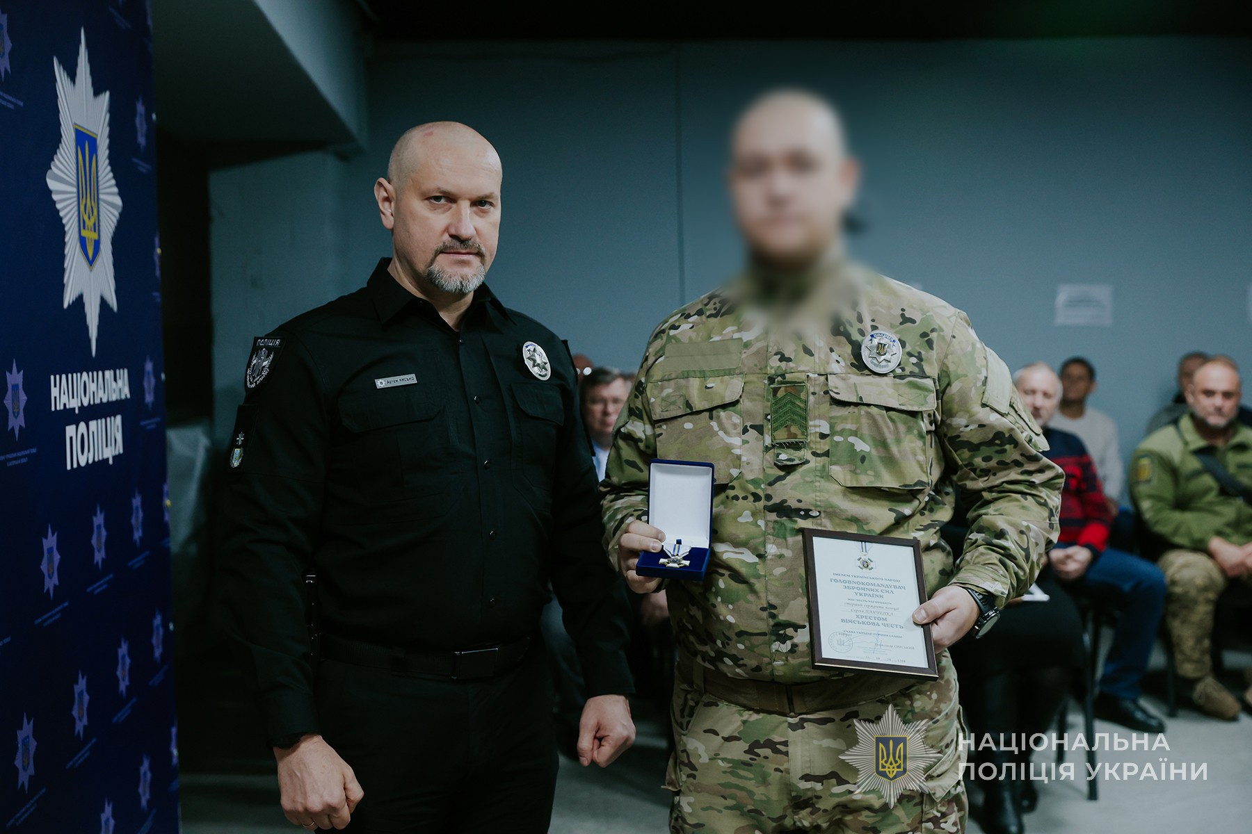 Почесними нагрудними знаками «Золотий хрест» та «Срібний хрест» начальник обласного главку нагородив діючих поліцейських, які роками віддано несуть службу у Запорізькому регіоні та виконують бойові завдання на передовій.
