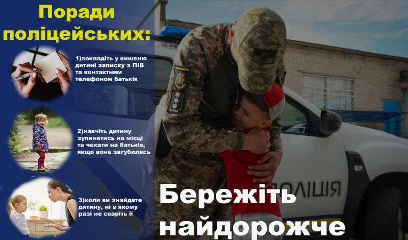 Шановні батьки та дорослі, як тільки вам стало зрозуміло, що дитина самотня або зникла, негайно повідомляйте про це до поліції: у найближчий відділок, на спецлінію 102 або урядову телефонну «гарячу лінію» Національної поліції України за номером 0-800-50-0202.