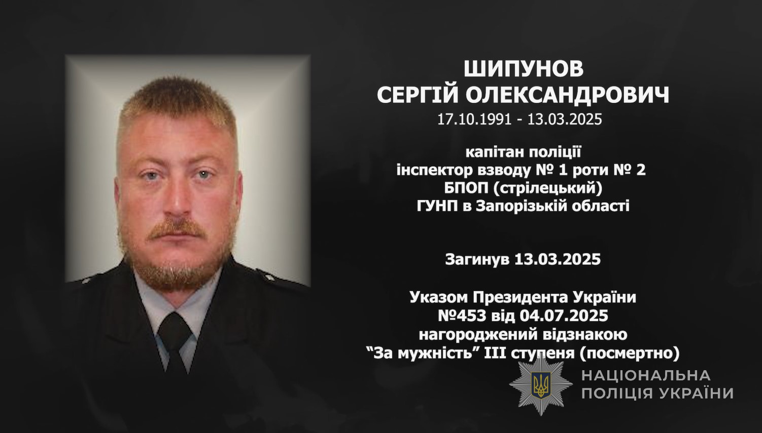 Капітан поліції Сергій Шипунов загинув 13 березня 2025 року під час виконання бойового завдання із захисту України від російської агресії на території Степногірської територіальної громади Запорізької області.