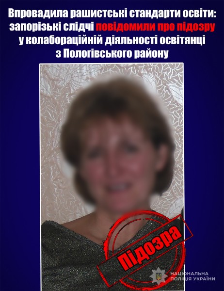 31 грудня слідчі під процесуальним керівництвом Пологівської окружної прокуратури заочно повідомили фігурантці про підозру у вчиненні злочину, передбаченого ч. 3 ст. 111-1 (Колабораційна діяльність) Кримінального кодексу України.
