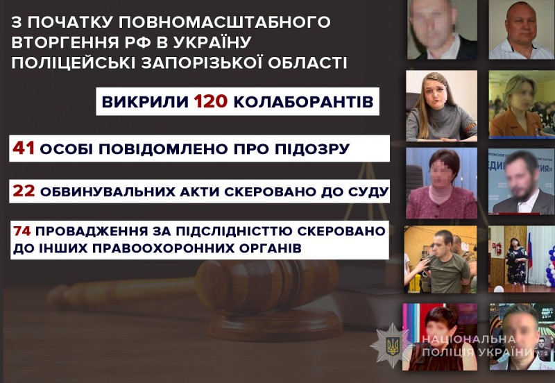 Від початку повномасштабного вторгнення окупаційних військ на територію Запорізької області місцеві правоохоронці викрили 120 колаборантів, які пішли на співпрацю із загарбниками. За цей час 41 громадянину України, які добровільно обійняли посади в незаконних органах влади, створених на тимчасово окупованій території слідчі повідомили про підозру. 22 обвинувальні акти вже передані на розгляд суду. 74 кримінальні провадження відносно зрадників скеровані до інших правоохоронних органів за підслідністю.