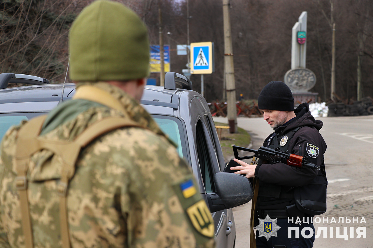 На стаціонарних і мобільних блокпостах несуть службі спільні наряди поліції, Національної гвардії, Військової служби правопорядку, прикордонної служби, а також територіальних центрів комплектування та соціальної підтримки.