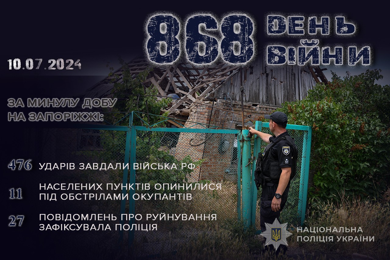 9 липня від влучань ворожих військ рф потерпала Пологівщина та Запорізький район. Загалом окупанти здійснили 476 атак з різних видів озброєння. По мирних населених пунктах рашисти застосували 228 БПЛА, здійснили 16 ударів з реактивних систем залпового вогню, 227 разів вгатили з артилерії та 5 - з авіації. Внаслідок дронової атаки на Біленьке постраждав 31-річний чоловік.
