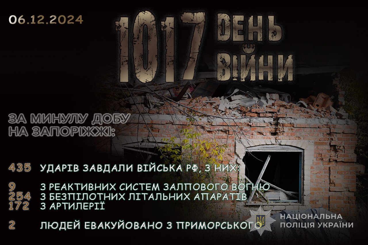 5 грудня загарбники застосували по містах і селах регіону 254 ударних безпілотники, завдали 9 ударів із РСЗВ та 172 - із артилерії. Внаслідок ворожих атак у Запорізькому, Пологівському та Василівському районах пошкоджені будинки та транспорт громадян. Обійшлося без жертв.