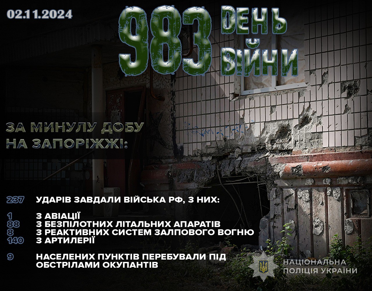 1 листопада окупанти вдарили з авіації, застосовували 88 ударних БпЛА, 8 разів вгатили з реактивних системи залпового вогню та 140 з артилерії по містах і селах Пологівського та Василівського районів. Поліцейські зареєстрували 32 повідомлення про руйнування об’єктів інфраструктури. Обійшлося без жертв.