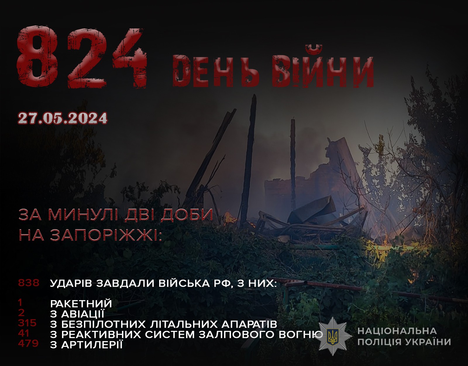 25 та 26 травня росіяни здійснили 315 БПЛА-атак, 41 удар із реактивних систем залпового вогню, 479 – з артилерії, 2 – з авіації та 1 ракетний. Унаслідок обстрілів зруйновані будинки мирного населення та об’єкт цивільної інфраструктури. Інформації про постраждалих не надходило.
